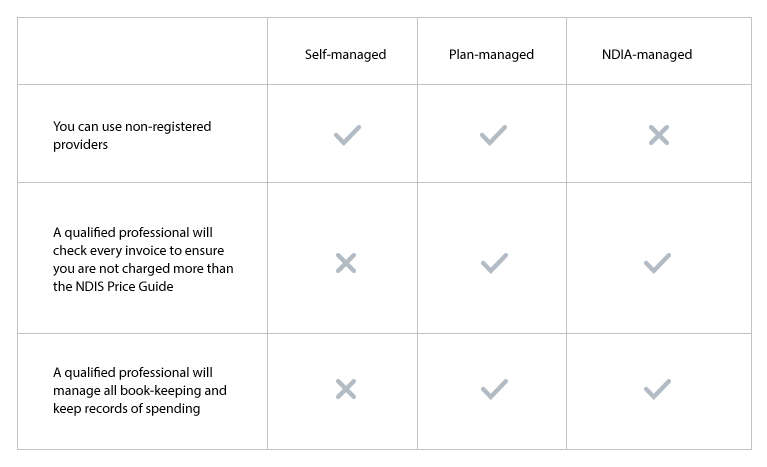 Even better, there is no cost to you of having a plan manager or the NDIA look after your plan. The costs are paid by the NDIA.